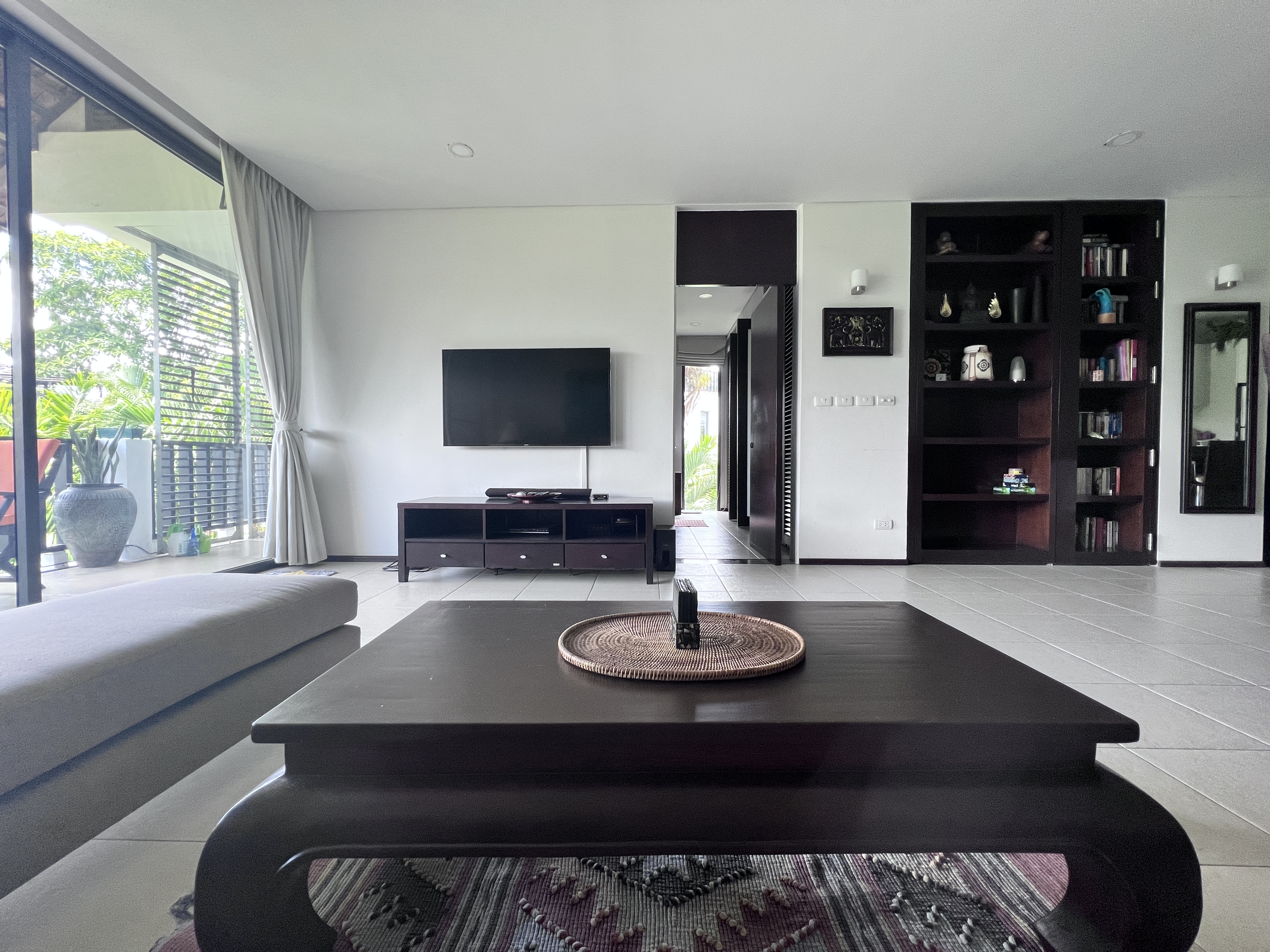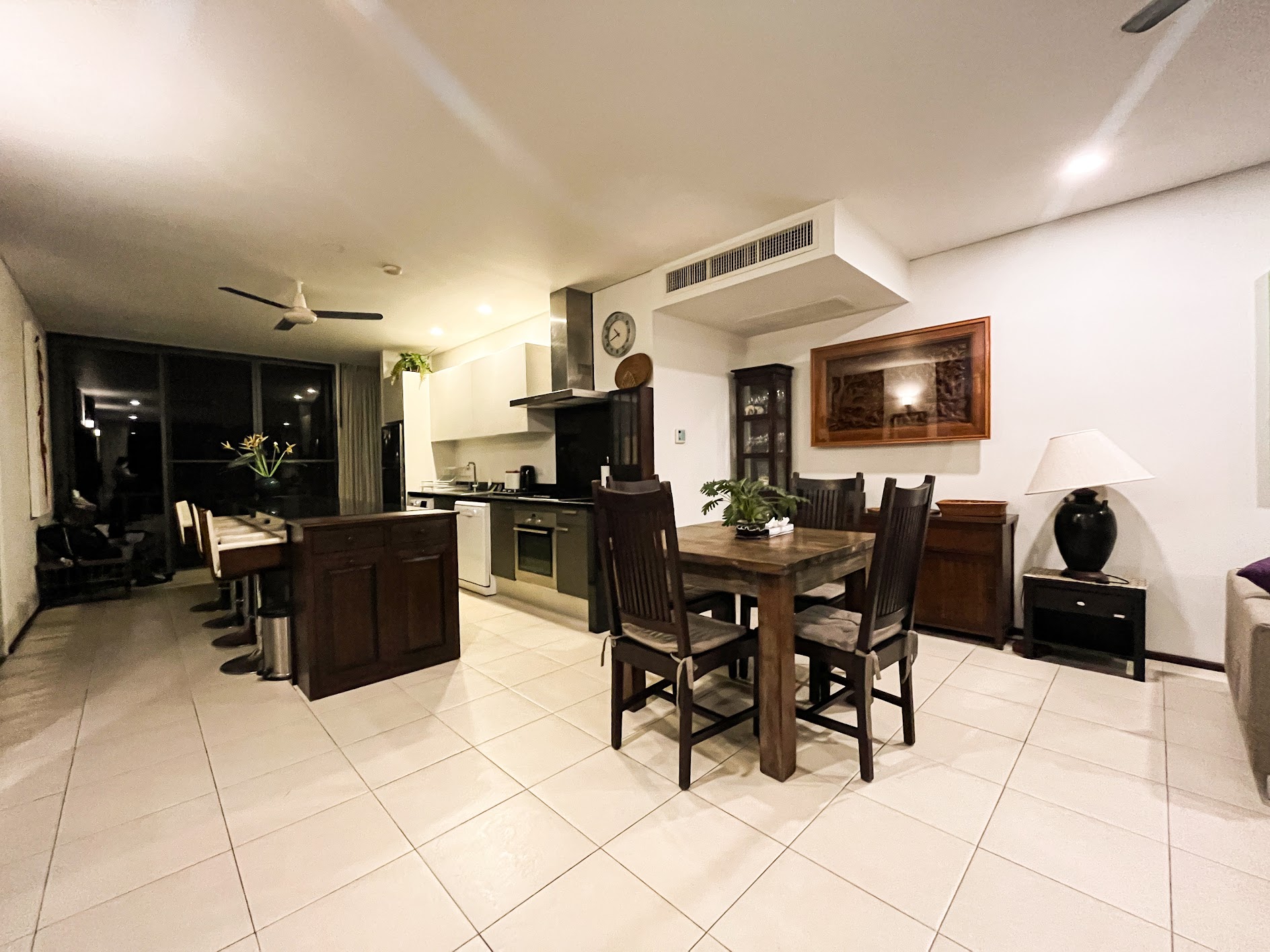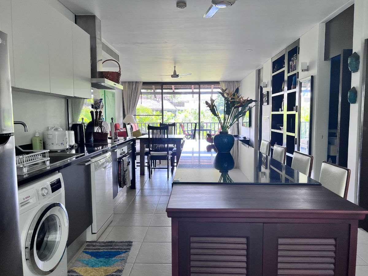 A fully equipped modern kitchen and living room mixed with traditional wooden Thai furniture.