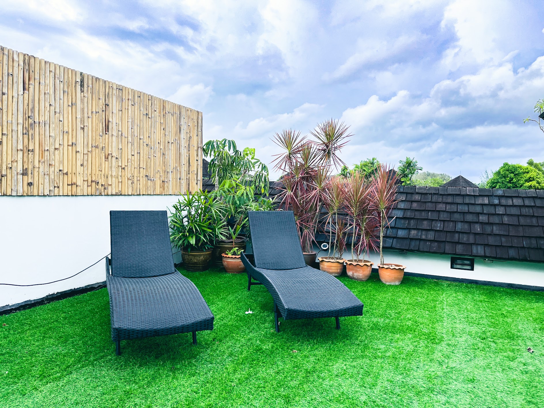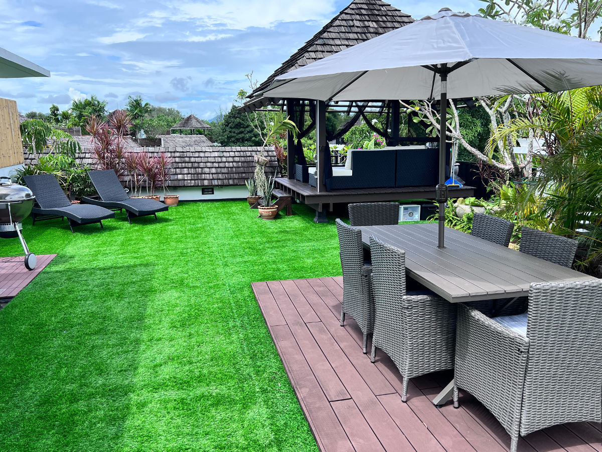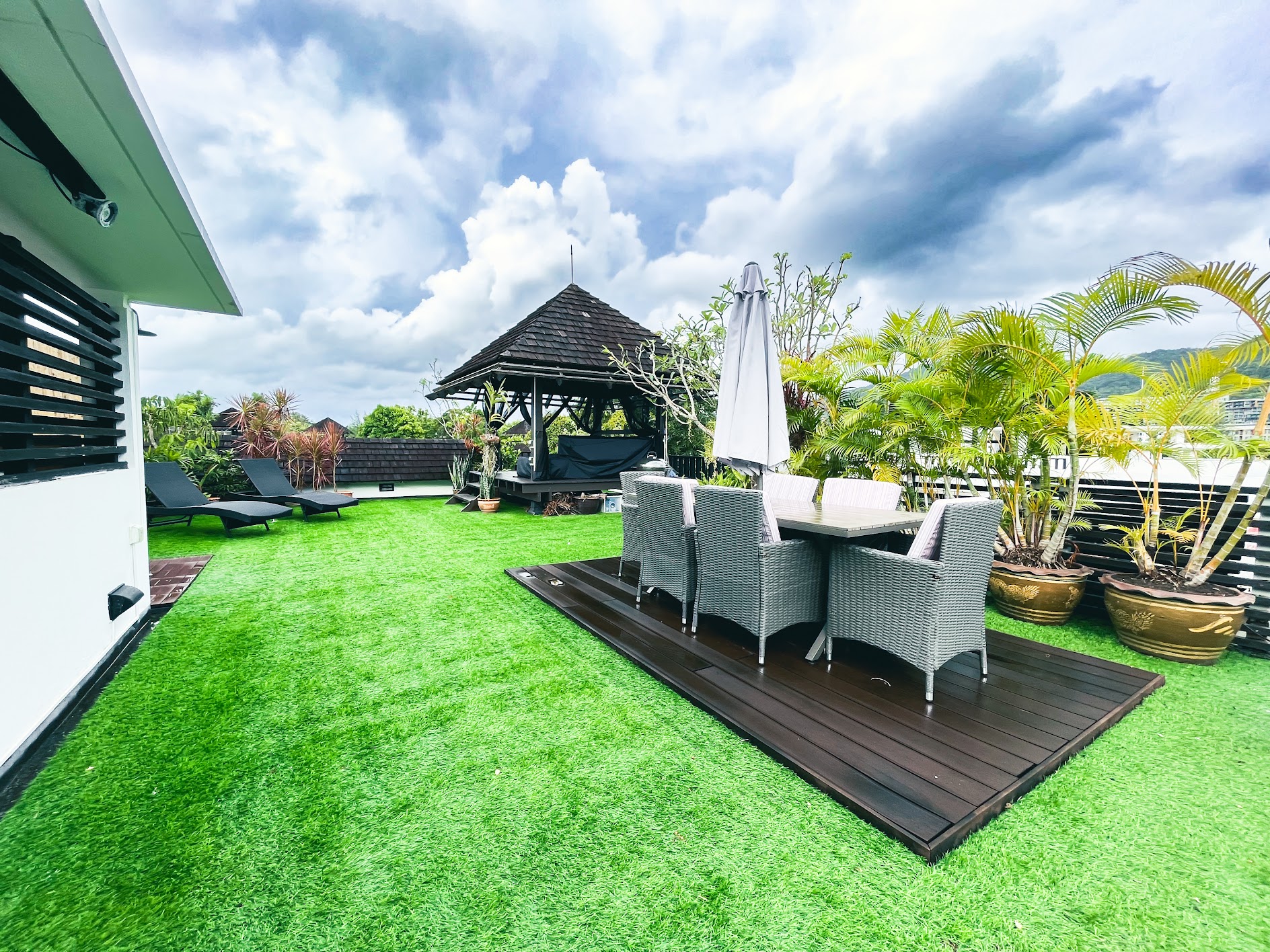 Private roof covered with artificial grass, tropical plants, sun beds, dining table and a gazebo with a comfortable sofa.